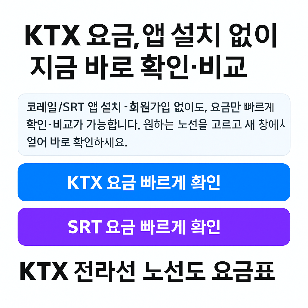 KTX 전라선 노선도 요금표를 가장 빠르게 확인할 수 있는 방법입니다. 코레일/SRT 앱 설치나 로그인 없이 요금만 즉시 비교하고, 원하는 구간별 요금표를 새 창에서 바로 볼 수 있습니다.